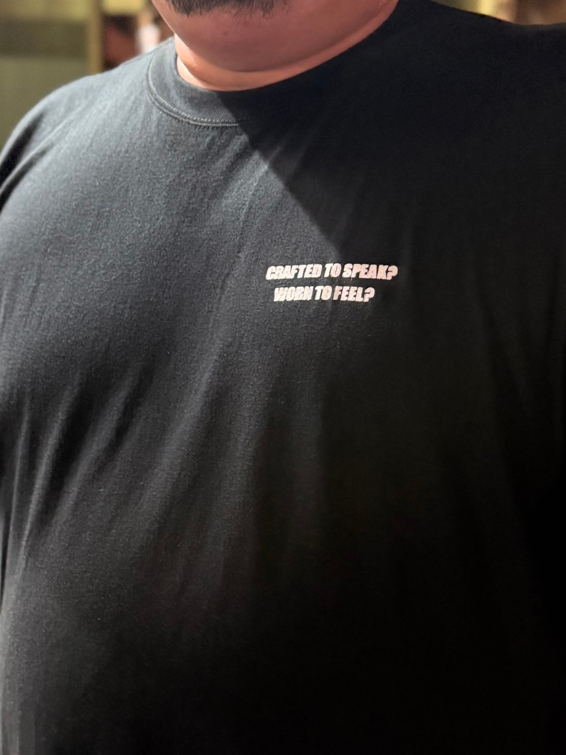 左胸にGRAFTED TO SPEAK? WORN TO FEEL?の文字を。