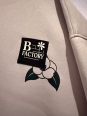 椿の花のプリントに黒パッチロゴを貼り付けています。袖には熊ロゴのタグ付き。