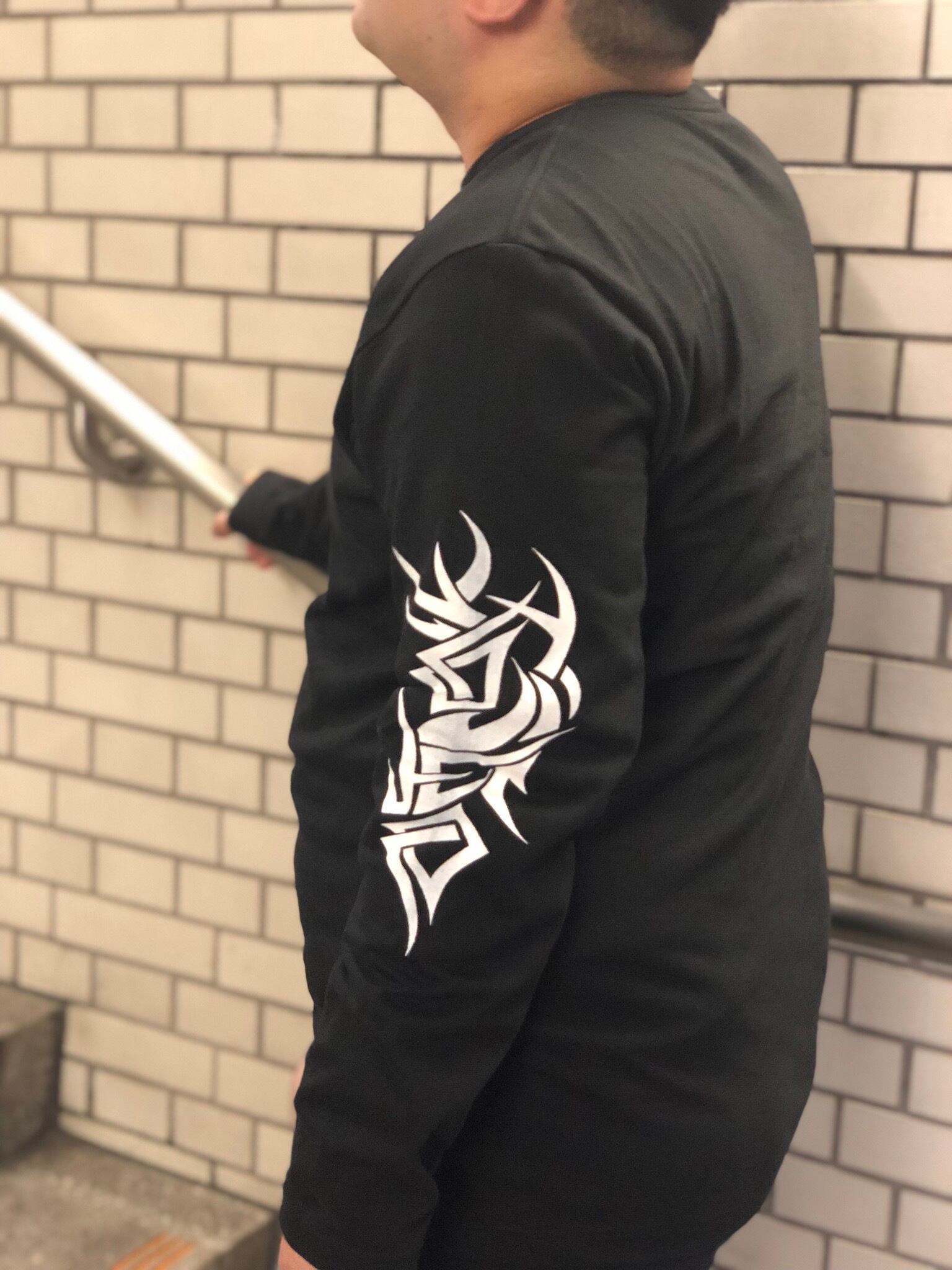BEARFACTORYの新作ロンTは肩のTRIBAL柄、前面の中抜きBOX LOGOデザインが印象的な男らしい作品になりました。