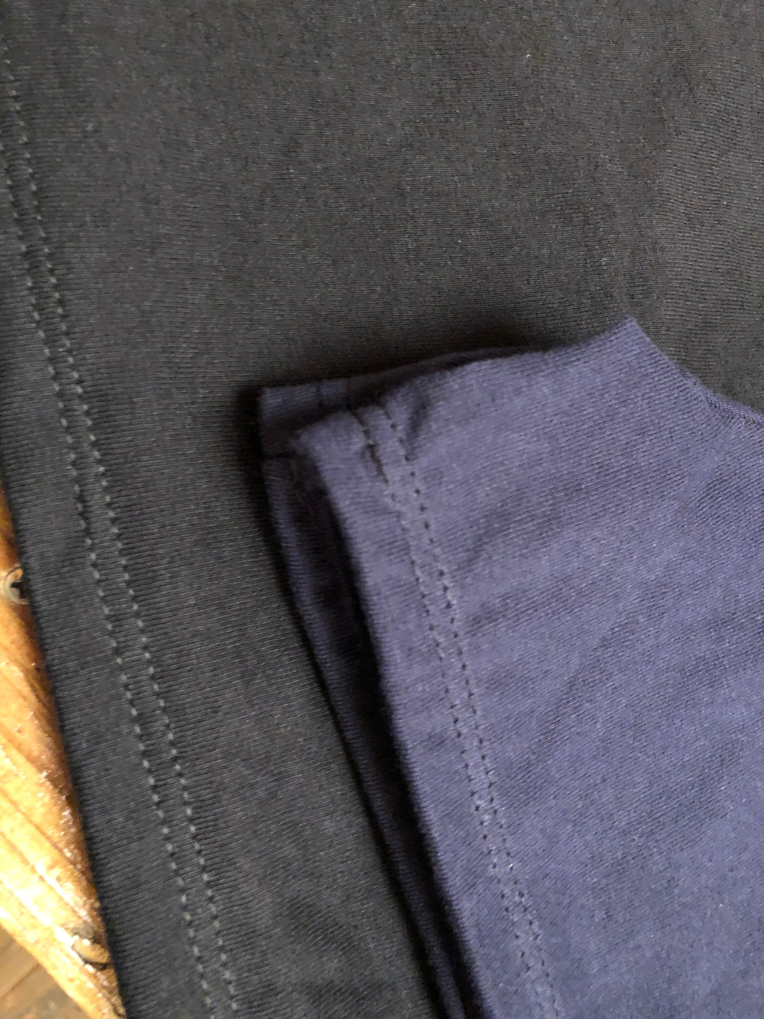 縫い方はダブルステッチにすることで強度を上げ、ジグザグ点線縫いをすることにより伸びに対応しやすいものになっています。比べてみてください。丈はサイズ表のサイズより約7cmカットしています。