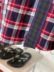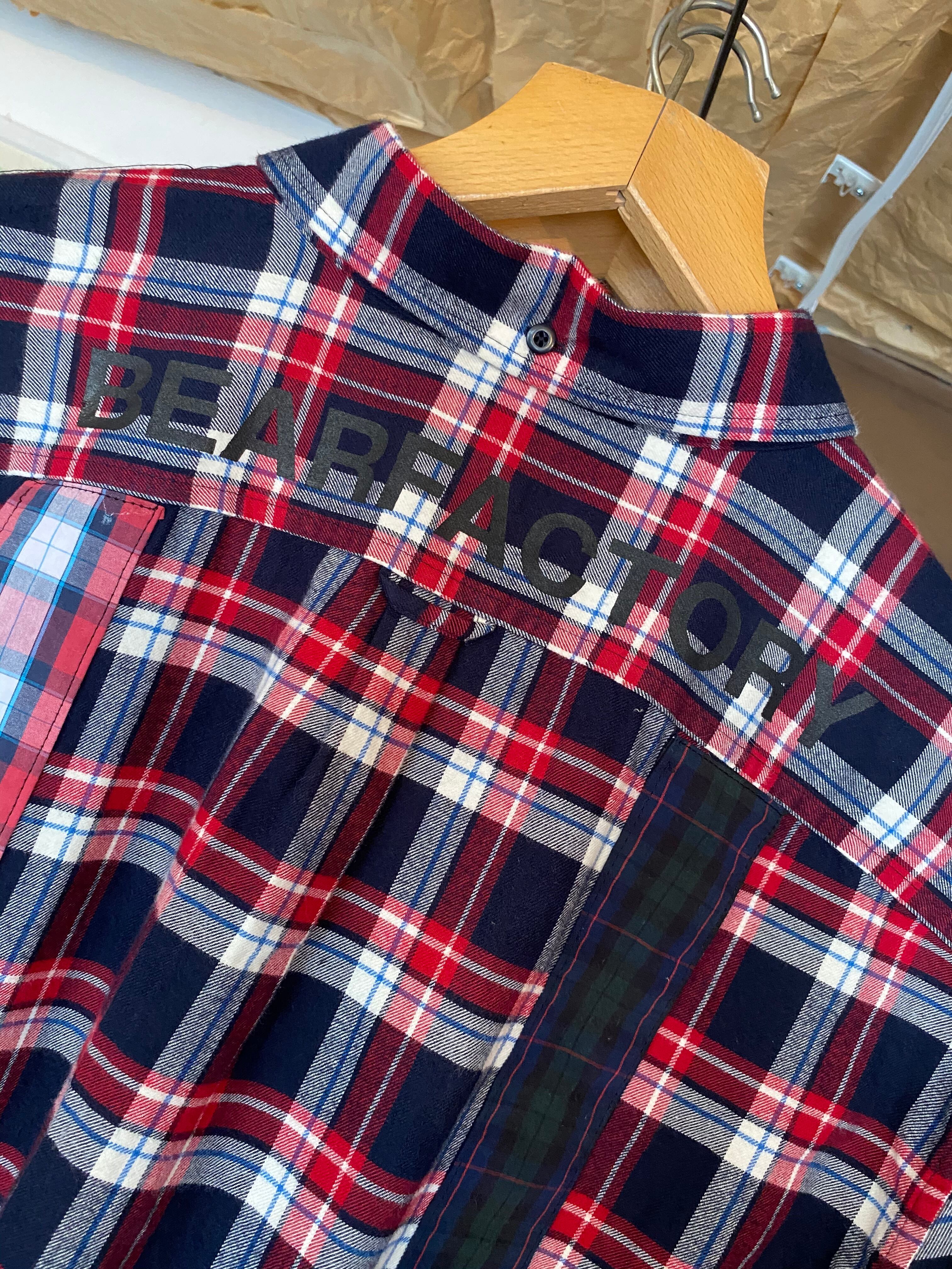 チェックシャツをたくさんドッキングしたリメイクシャツになります。