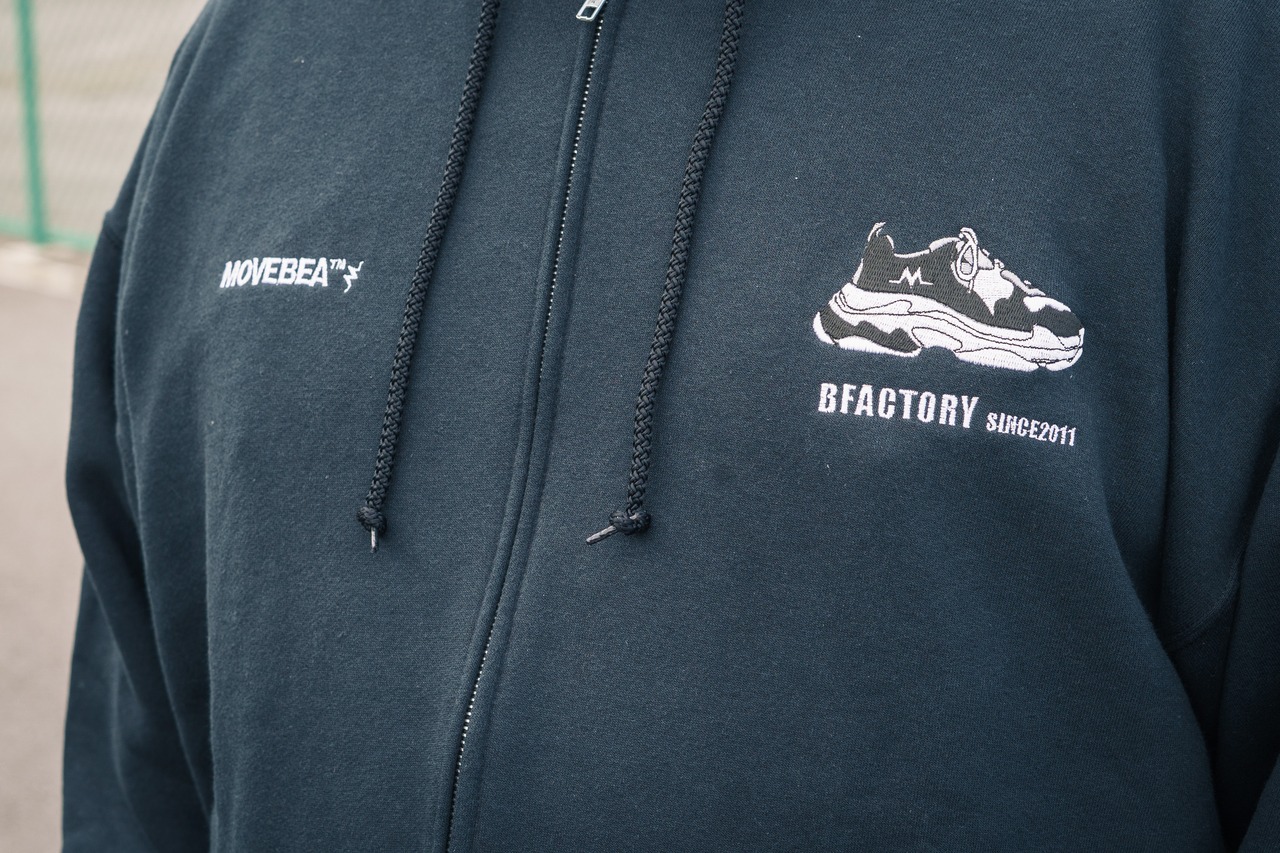 MOVEBEA SHOESデザインの刺繍ジップパーカーです。後ろにはベアラジオのタグ付きになります。
