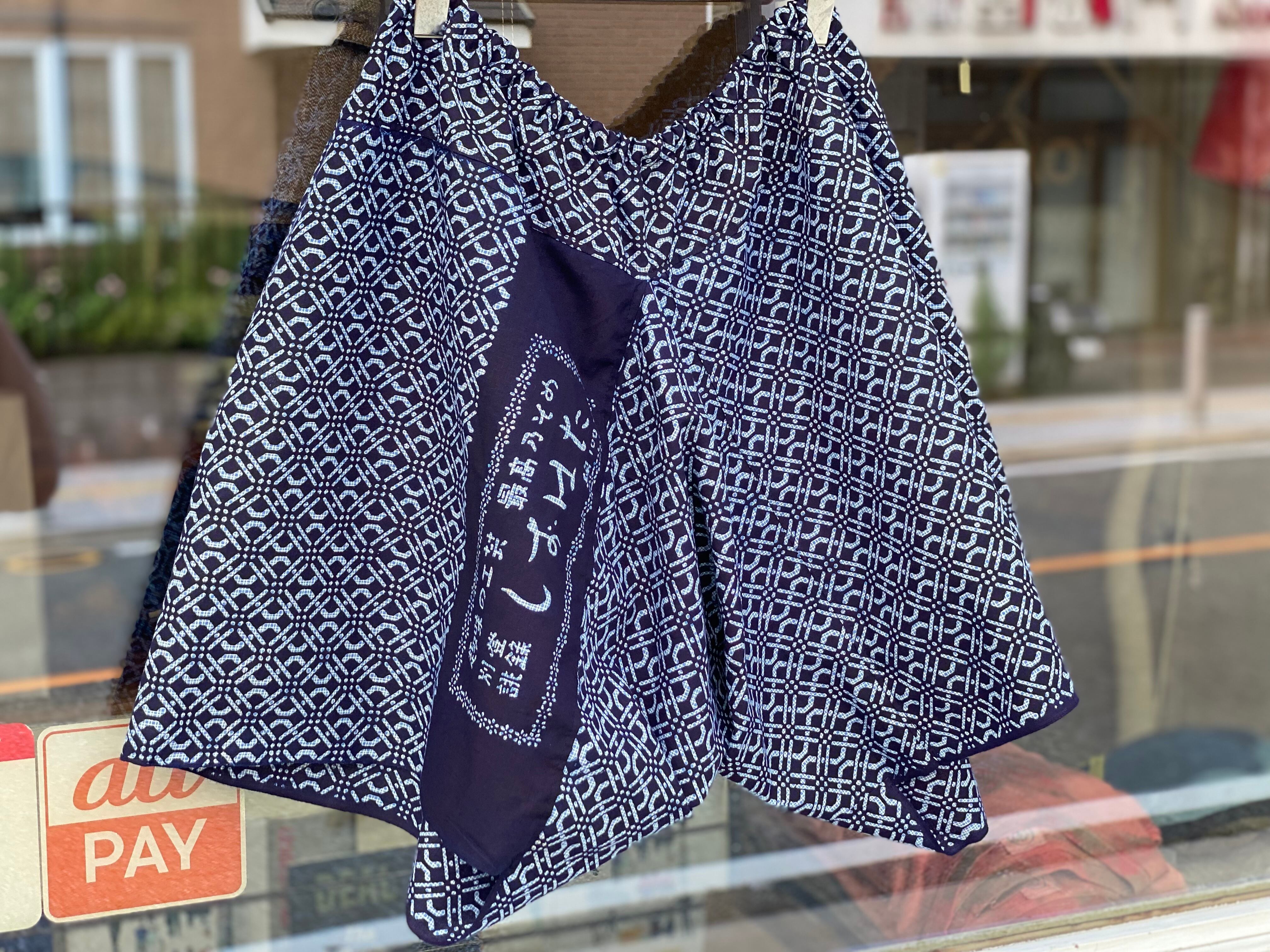 去年のに比べて平紐を使用しており結びやすくなりました。こちらのパンツは裏側に違う生地を使用していてそこがアクセントになっています。こちらはフリーサイズです。