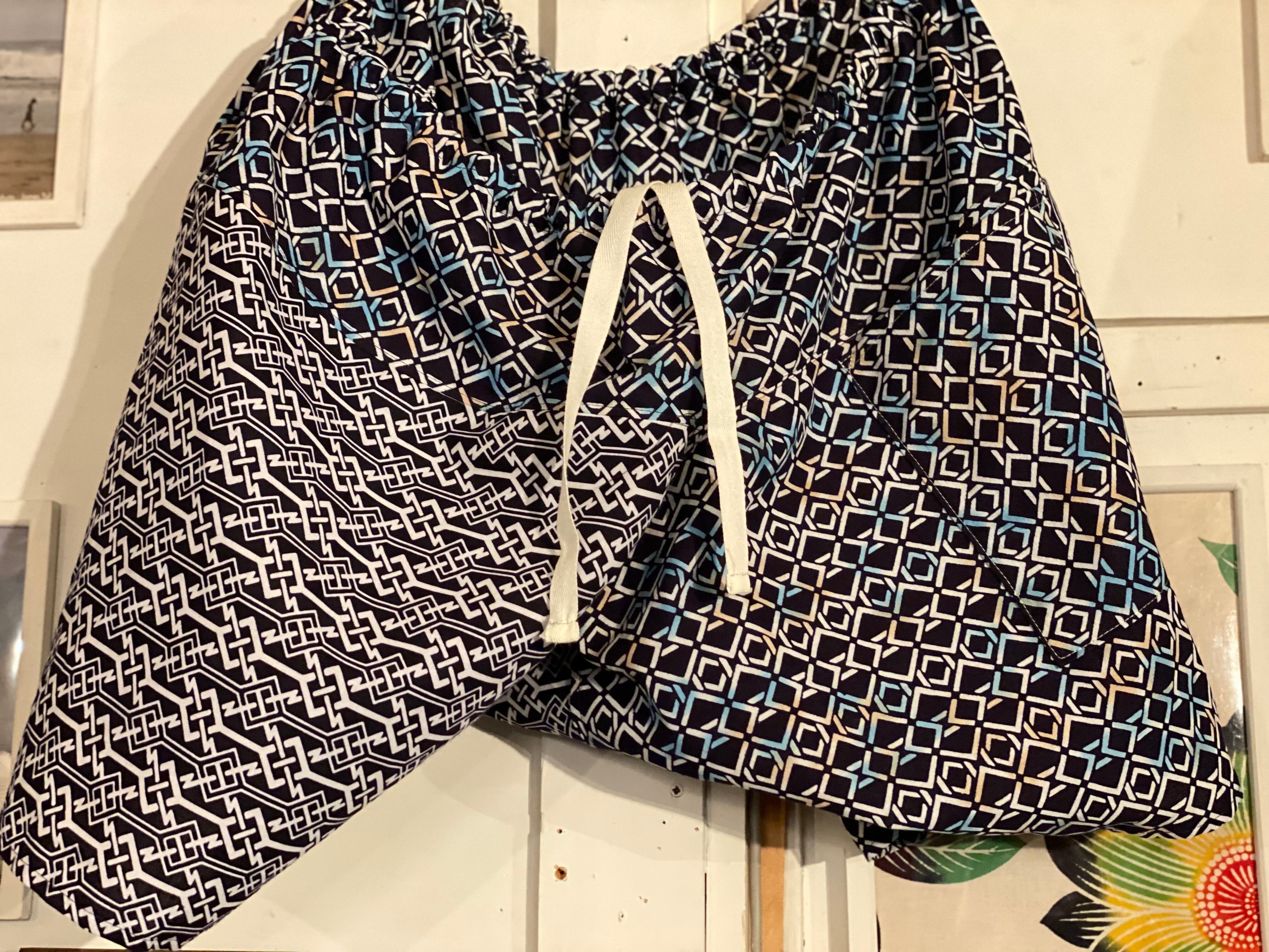 大きく見えますが股部分が広くしゅっとしています。お腹周りは紐で結ぶことが出来調整できます。