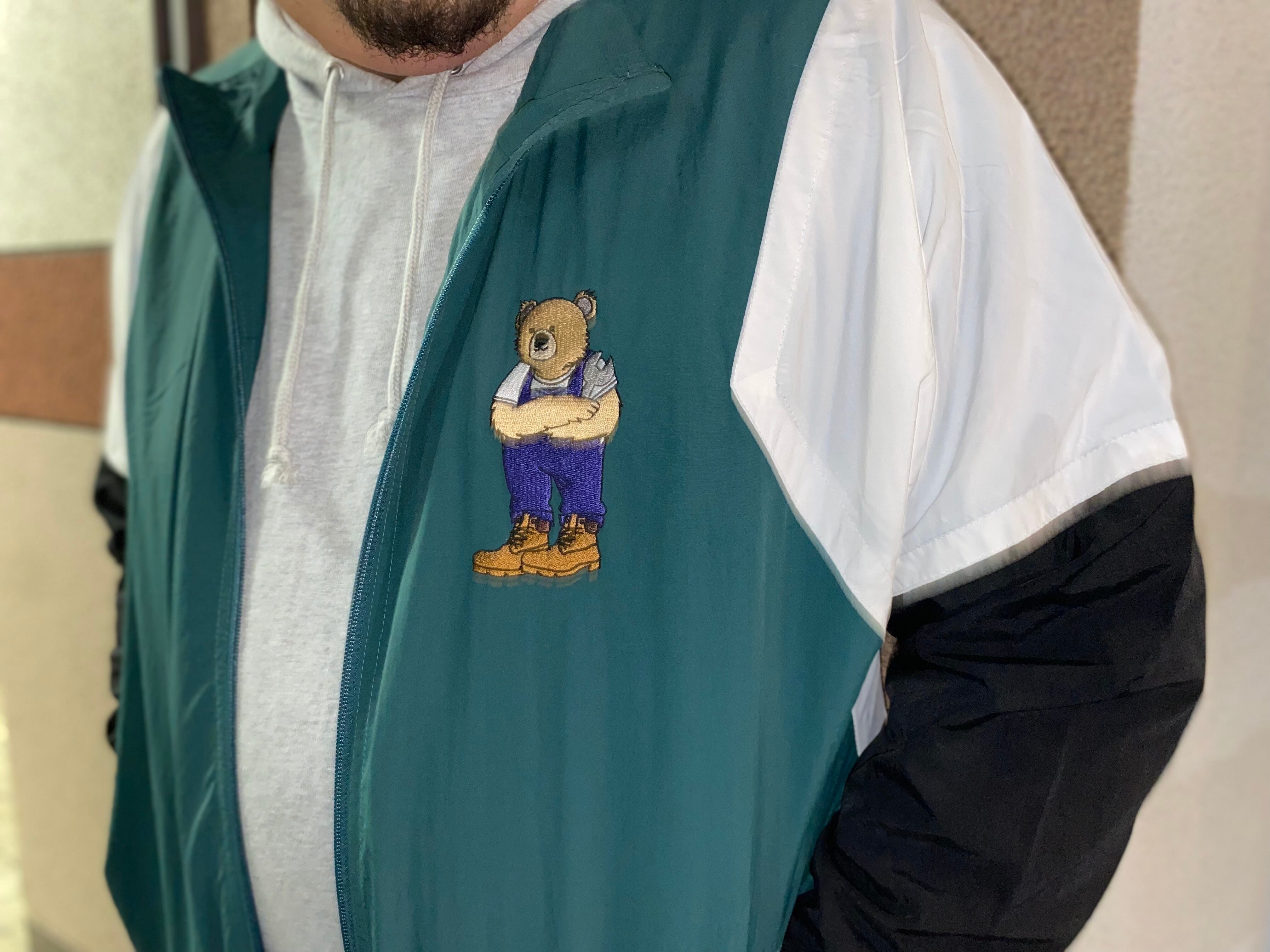 左胸に整備士さんのワンポイント刺繍が入ったトラックジャケットになります。