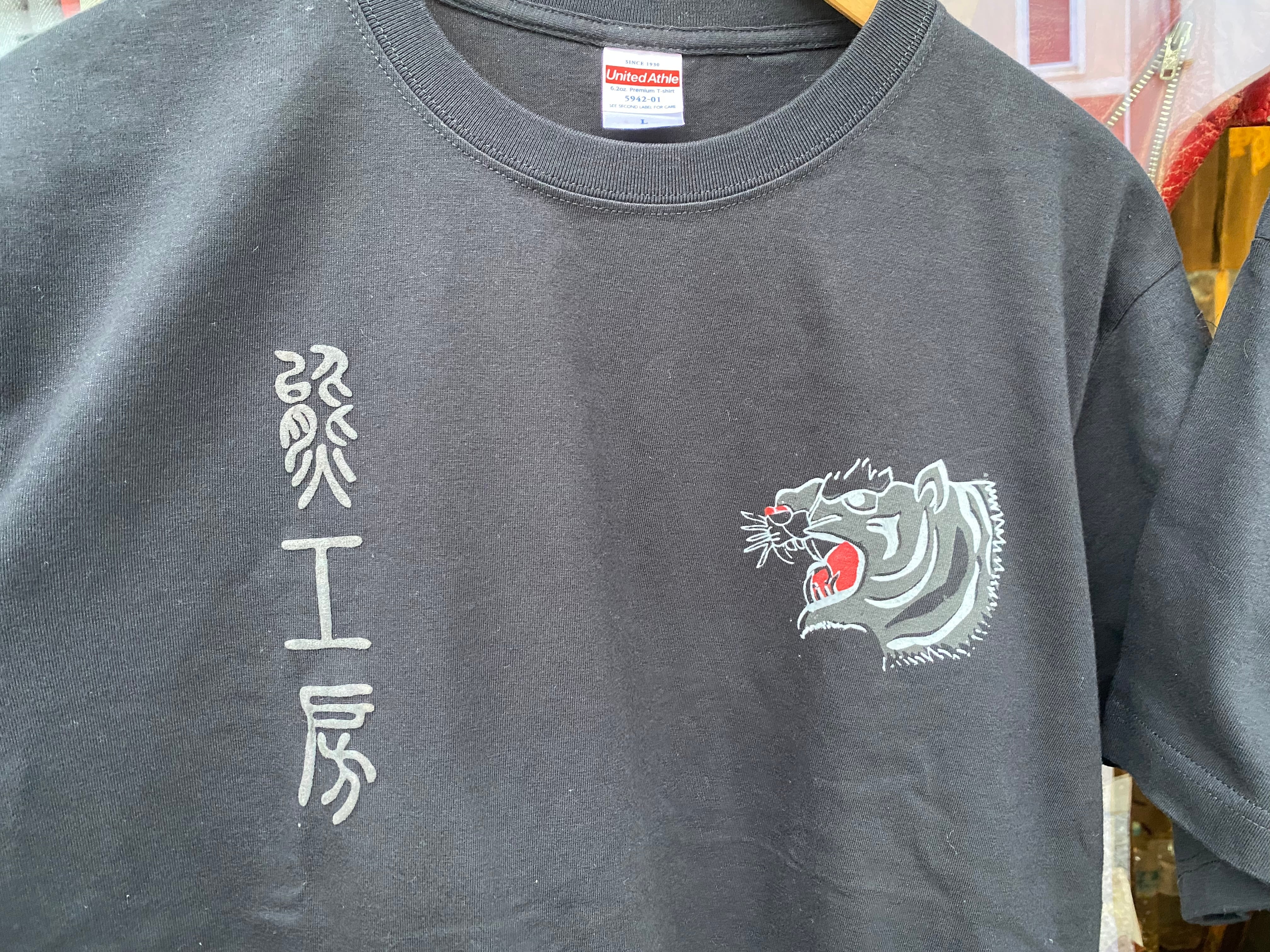スカジャンの刺繍の虎をシルクスクリーン用にデザインしたものです。右胸には蒙文で熊工房と入っています。