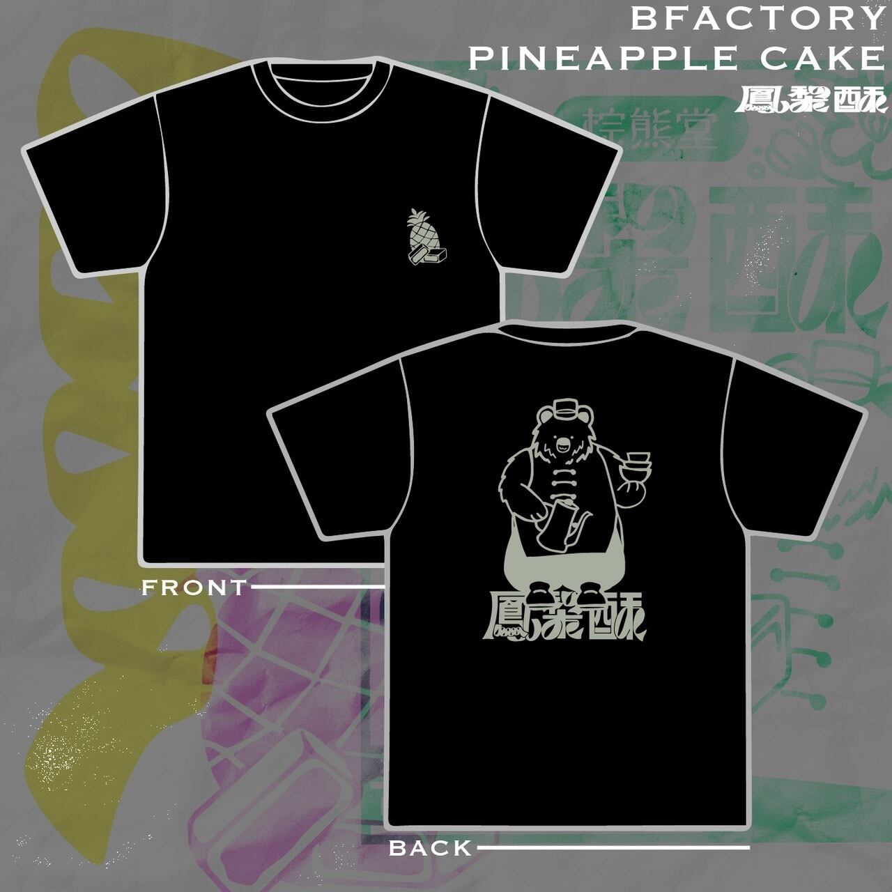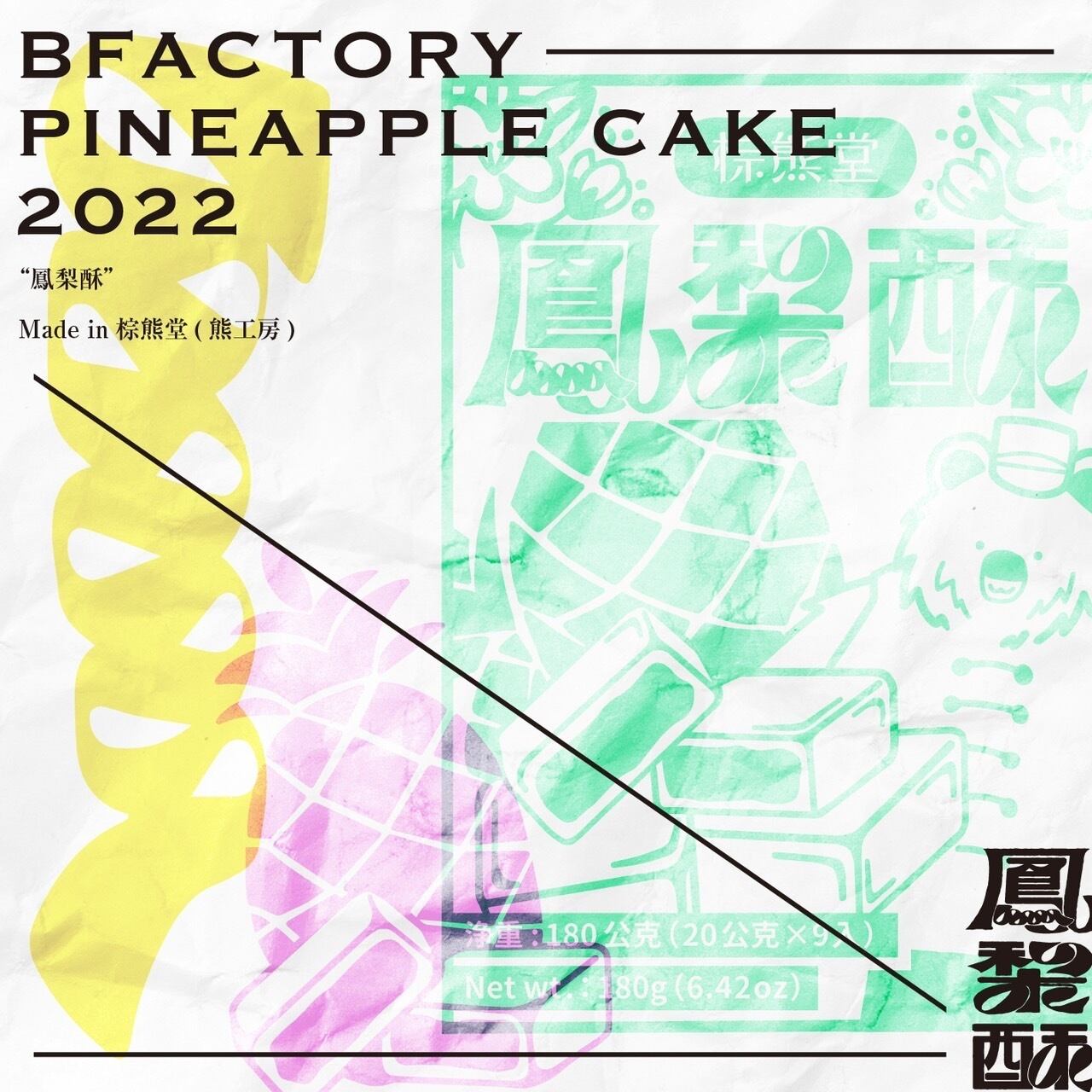 茶器を持ったくまさんがキュートでパイナップルケーキの文字、タイポグラフィは一文字ずつデザインしています。
