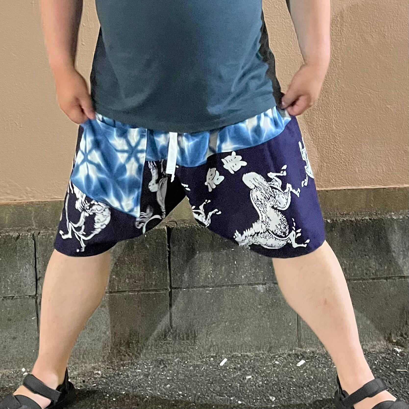 綿100%の手染め泥染、藍染布、ヴィンテージの相撲浴衣布(こちらも藍染)を使用してパッチワークして再構築しハンドメイドで製作した四股パンツになります。