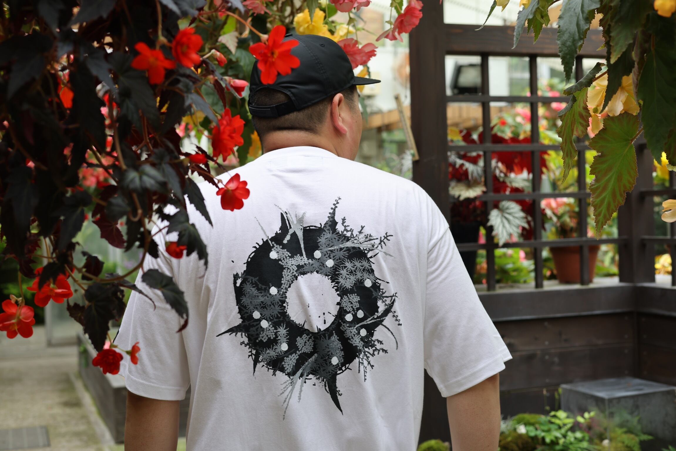 フロントに3版のフラワープリント、バックにはリースをプリント。色味をそれぞれ近くすることでリースの濃淡が美しく表現されています。