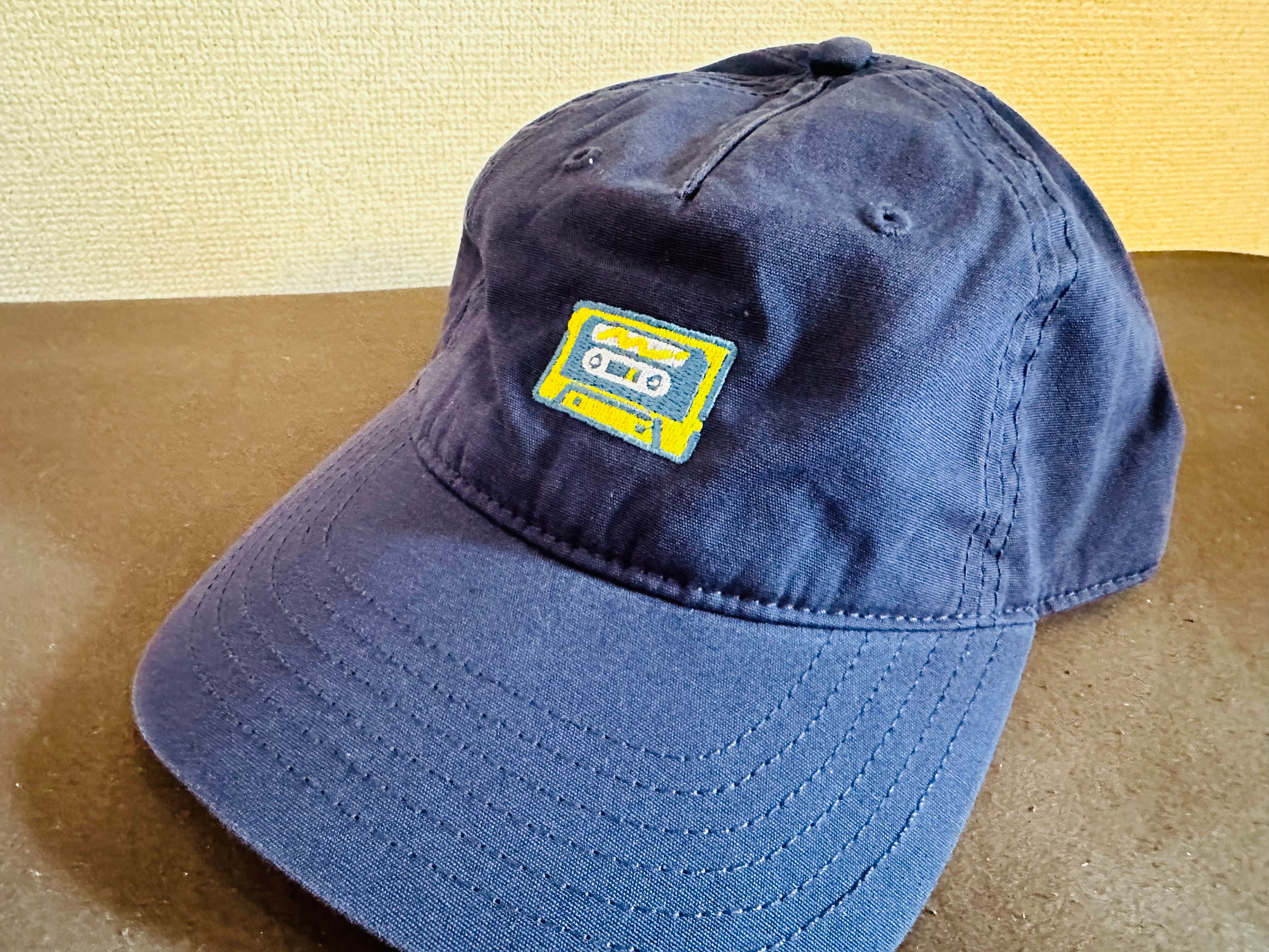 カセットテープのワンポイント刺繍が入った丸ツバキャップになります。