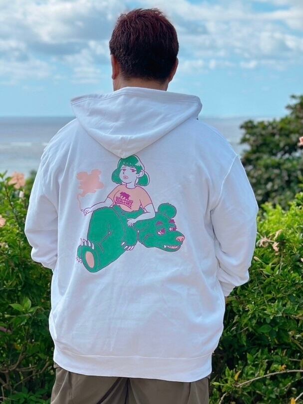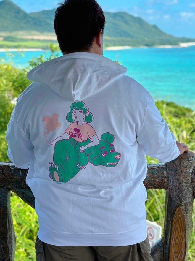 毎年力を入れて製作してるガールデザインですが今回はデザイナーしんごさんに描き下ろしていただいきました。着ぐるみ着たグラマラスな女性のアンニュイな感じがプリントされておりパステルカラーで3カラー展開しています。