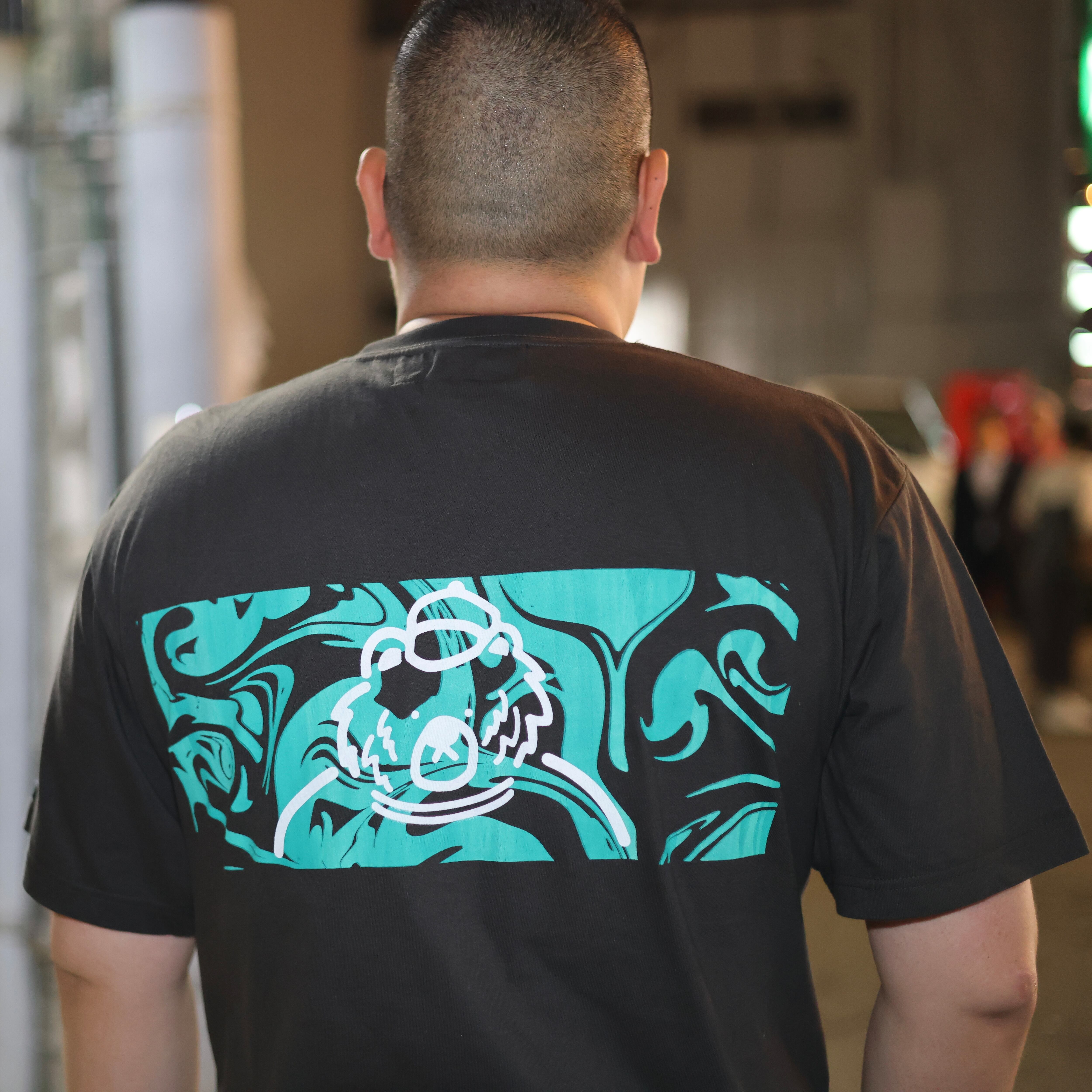 緑のマーブル模様に熊が浮き上がっているデザインでシルクスクリーンの特性を生かしたアイテムになっています。