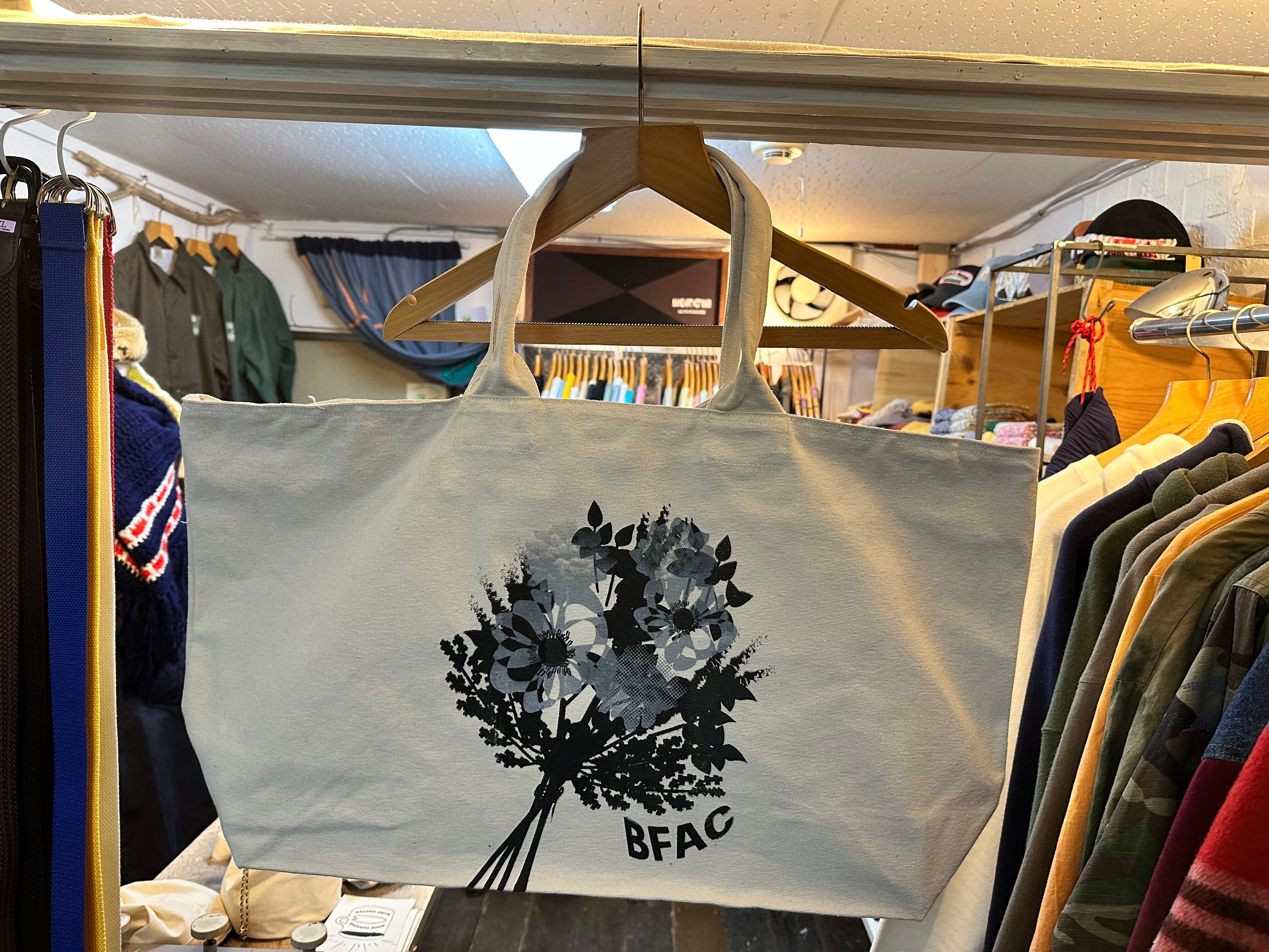 花束がシルクスクリーンプリントされた大きめなトートバッグです。