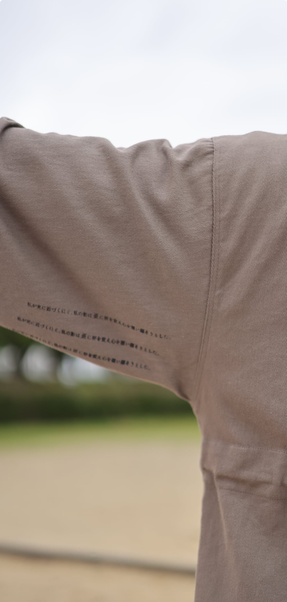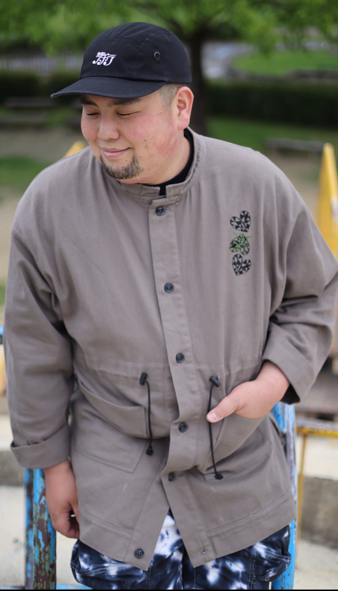 左胸にハートの刺繍と左袖にプリントを入れています。フード部分を切り取りリメイクもしています。