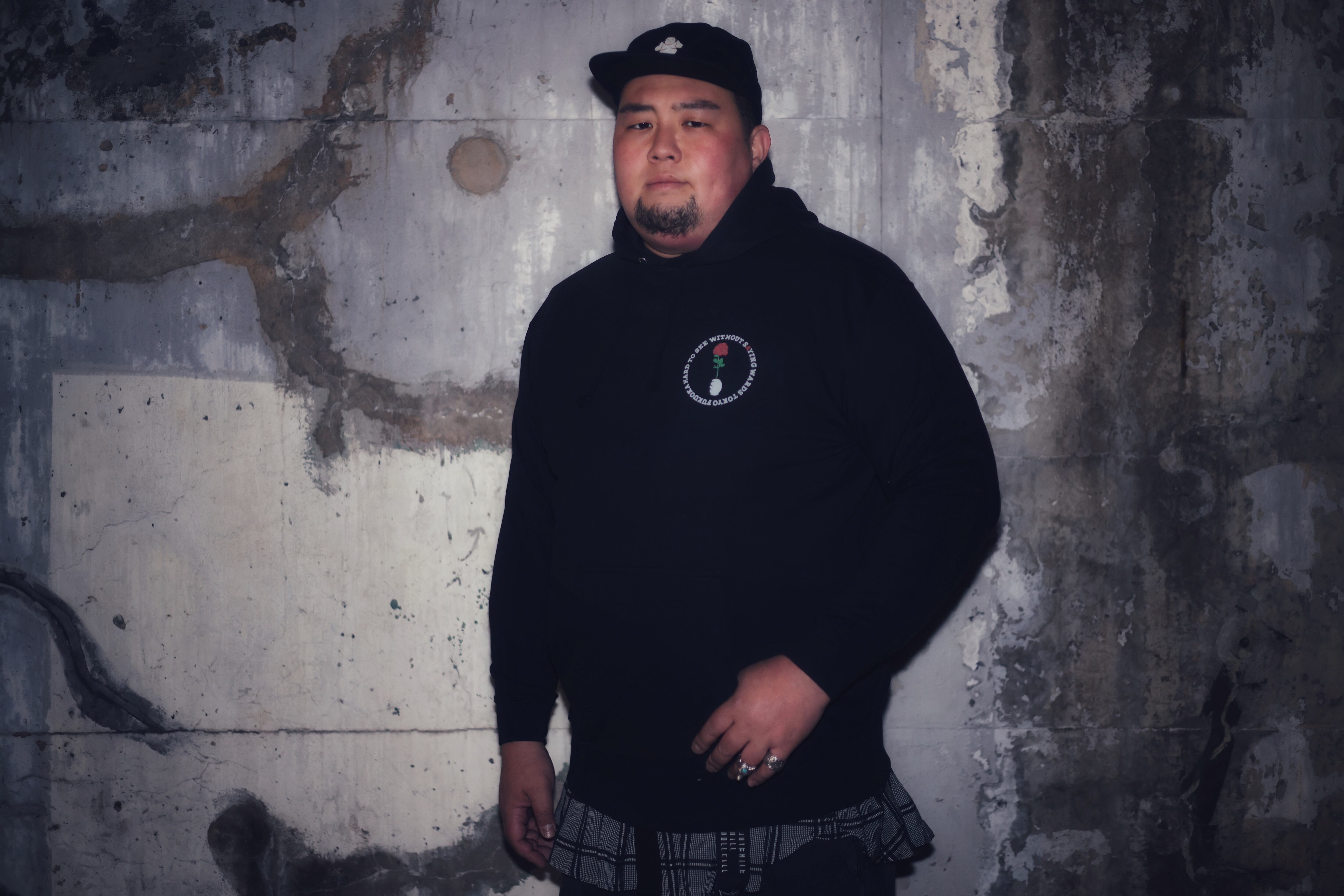 バックプリントの柄は漢字の花とBFロゴを組み合わせています。見方によって花、ロゴ、薔薇と色々な捉え方が出来るよってところにかけています。